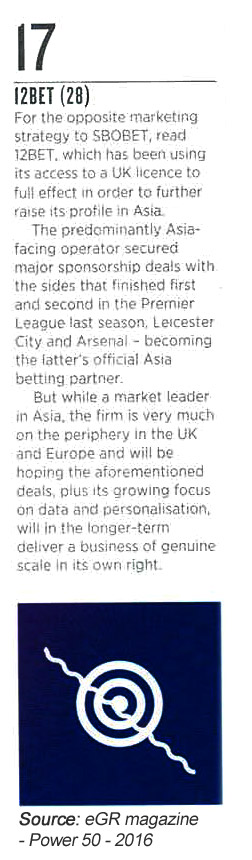 아시아 프리미어리그 온라인 부키 & 카지노, 12BET은 전 세계 온라인 게이밍 오퍼레이터 순위 선정 28위에서 17위로 올리며e게이밍 리뷰 매거진 파위 랭킹에 자랑스럽게 이름을 올렸습니다